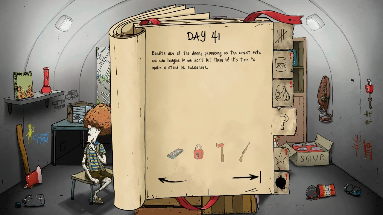 1. We have a situation on our hands! There is a group approaching our shelter and they don't seem like the occasional, freindly scavengers you run into it. Not at all. They look like they're out for blood. Or cans. Probably cans. This is a terrible time for humanity if canned soup is enough to turn us into monsters! Anyway... We need to defend ourselves!